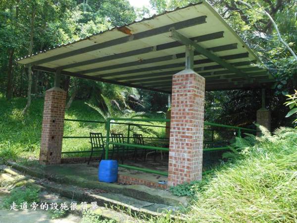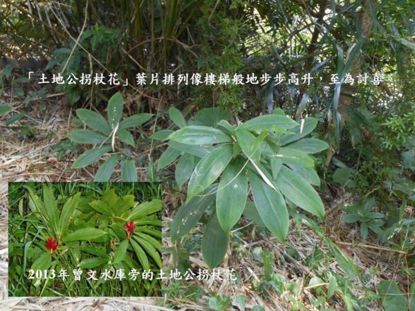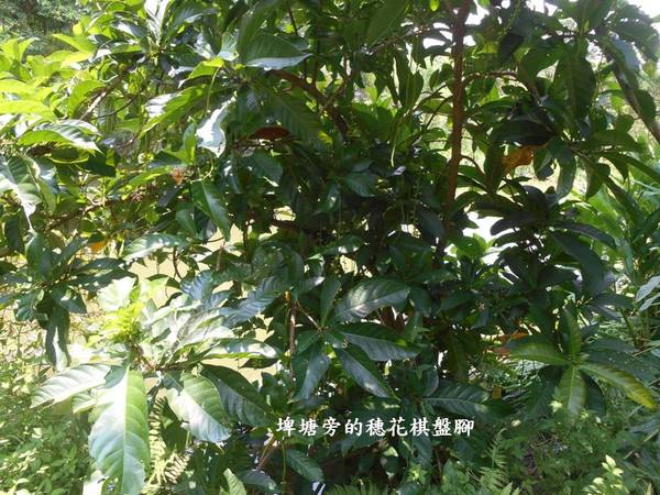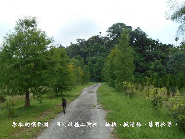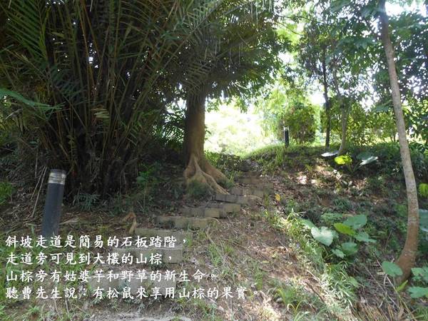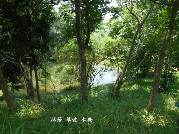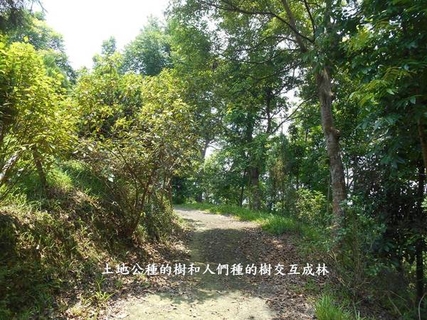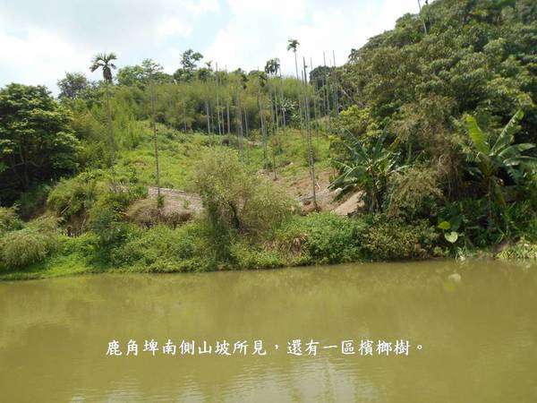 我們在艷陽下,行走在環繞家屋的的林蔭間,斜坡走道是簡易的石板踏階,走道旁可見到大欉的山棕,山棕旁有姑婆芋和野草的新生命,聽曹先生說有松鼠來享用山棕的果實;另外一種野喜歡山棕果實的果子狸,也就是白鼻心,因為是夜行性動物,曹先生他們沒有看見牠們的身影。斜坡上來的第一層環山林徑中,看見山凹裏還藏著另外的水塘,顯示出山居人家善於蓄藏水資源的生活智慧。水塘旁人為種植的穗花棋盤腳,到了夏季花開時節,讓這裏的夜晚展現煙火般的炫燦;其它如烏心石、肖楠、大葉桃花心木等,也都已經成林;曹先生說,二十多年前種的桃花心木長得又高又大,冬天結果,大約在農曆年前後,果實成熟迸開時,一片片竹蜻蜓般的種子從天而降;土地公幫忙種植的柺杖花、血桐、野牡丹、、,幫這裏增添美麗的色彩,讓人想見土地藏了很多種子,伺機冒出頭來的動人情景。我們慢慢走往鹿角埤的途中,原本一大片檳榔園,如今改種二葉松、扁柏、楓港柿樹,還有路旁的落羽松,都生長良好。