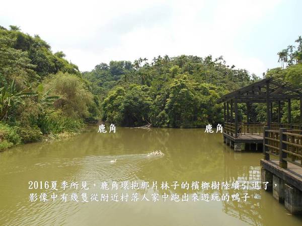 來到久違的鹿角埤,我們看見鹿角環抱那片林子的檳榔樹陸續引退了,幾隻從村落人家跑出來玩的鴨子悠游水中央;為了便於觀察教學而設置的平台,讓人們可以走到埤塘水面上,環顧四周地景。有一篇兩年多前格友的文章提到這裏長了很多槐葉萍和人厭槐葉萍,村民無法清除乾淨,國軍單位還曾派遣官兵來協助清除呢。(請閱:〈嘉義中埔─鹿角埤生態園區〉http://blog.dcview.com/article.php?a=VmsBZwxrV2MCYw==) 由此可以看出,經營維護一方自然野地,過程並不簡單易行。