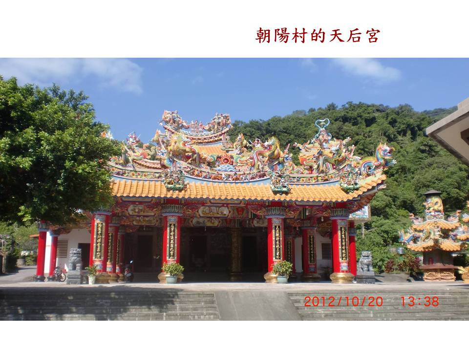 宜蘭縣 (http://mookyilan.ilccb.gov.tw/modules/news/article.php?storyid=93) 文化局網站敘述,兩百多年前,台灣許多地區的先民到大南澳地區拓墾,當時以海路交通為主,在娜娘仔口(朝陽漁港)登陸。由於遭到瘟疫的侵襲,不少人被奪走性命;來自新竹州的客家人徐阿紅,在前來大南澳地區從事樟腦業時,隨身奉請「天上聖母」令旗以保安康,隨後遷居朝陽地區,事業十分順利,媽祖神威從此傳開。於是從最早的搭建紅壇(茅舍)奉祀,因著香火鼎盛,逐漸改建為美輪美奐的廟宇,從此成為大南澳人的信仰中心。大概也因為這個典故,朝陽社區曾經爭取到行政院客委會的補助,尋找並重建客家族群的文化事蹟。但以目前我們經由環保局安排的拜訪行程,沒有遇見會說客家話的鄉親。
