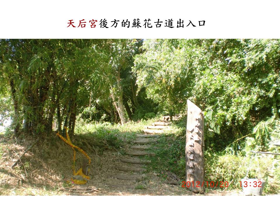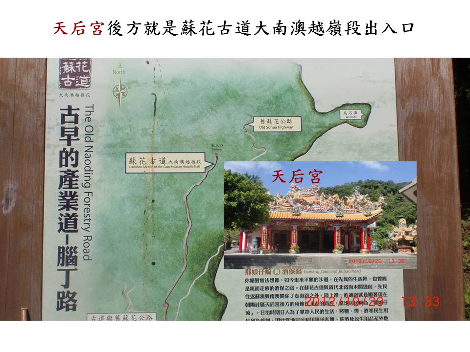 就在天后宮的後方,有蘇花古道─大南澳越嶺段的出入口,這條古道是從東澳與南澳之間的新澳隧道,循著南澳嶺稜線越過南澳嶺,然後來到朝陽里的天后宮 後方,全長約4公里。翻越大南澳嶺,銜接娜娘仔崎及酒保路到朝陽社區,沿途可欣賞東澳沖積平原、東澳灣、烏石鼻、大南澳平原及觀音海岸等美麗景致。這段行程還可以親身見證全台最古老的地質,體驗宜蘭和花蓮兩種截然不同的天氣類型;宜蘭多雨,花蓮則多為晴朗藍天。
