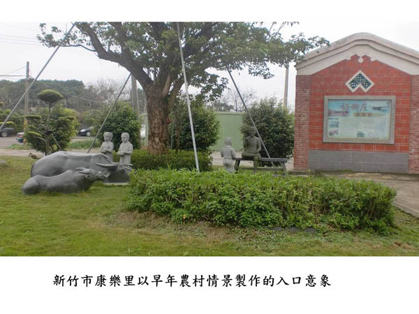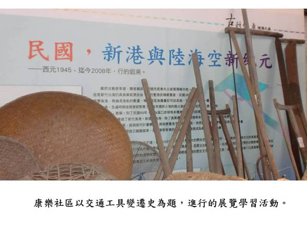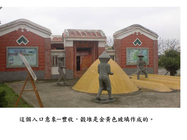 這幾年來,在社區尋找閒置空間,陳列早期生活的器物,以展覽史料來讓鄰居們認識社區的歷史。在進入社區的大馬路邊,他們以早年的農村情景作為入口意象,並且運用新竹特產─玻璃作為材料,作成了金黃色的穀堆,十分用心。