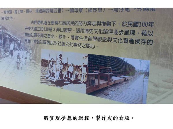 在擔任里長、開始參與社區營造事物之後,特別體認到敦親睦鄰、家家平安的重要;而要營造這些溫潤人心的氛圍,似乎很倚賴「喚起共同的歷史記憶」。所以他們用心踏查社區,一一查出被彈擊的牆面、防空雕堡、輕便車驛站、曬穀場等等人文資源。