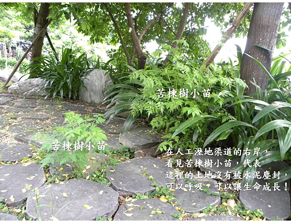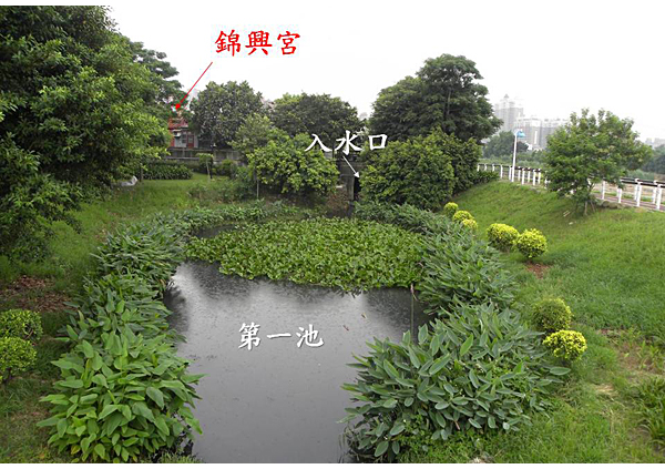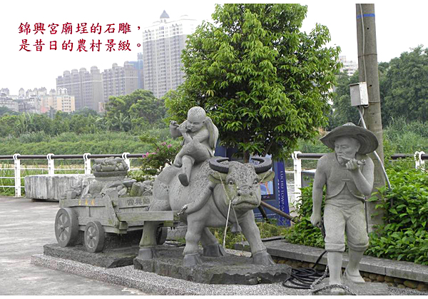 園區的入口在錦興宮旁邊,我們在廟埕看見大型的石雕作品,雕的是老牛、老農和騎在牛背上的小孩子;在早年的農村,河流水圳、田頭伯公、拙壯的老牛,呈現的就是樸實與溫馨的景像。如今,河對岸高樓櫛比鱗次,整個環境的涵容受到高度衝擊,我想這應該是設置這區人工溼地的重要原因!溼地猶如人體的腎臟,對健康承擔無比重要的角色功能。