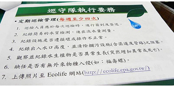水環境巡守志工很清楚這個重要姓,所以他們努力付出‧學習巡守重點。長期參與環保志工的莊村長說,他們是去年才正式成立水環境巡守隊,有分組,有經驗的人一天叫兩位沒經驗的來跟;天氣很熱,他們就等太陽下山之後去撿垃圾,才比較舒服。在作業上有幾個重點: