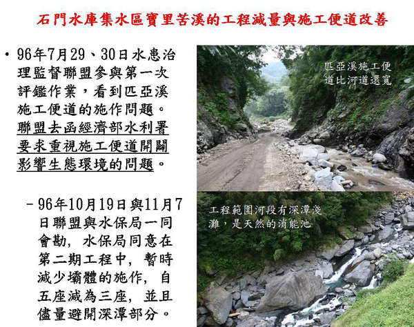 為了改善上述這些情形,水利部門於是在2006年立法通過的《石門水庫及其集水區特別治理條例》開始實施之後,納入生態保育思維,試行『生態檢核作業』,歷經研發、規範制定、案例試辦等過程,至今已經有了較為成熟的作業技術。今年9月19日那天,有學術界、政府部門和我們民間團體等各界人士,應邀到曾文水庫、烏山頭水庫等集水區進行【生態檢核成效訪查】,走訪了幾個採取『生態檢核措施』而完成的工程,遂提出來跟諸位聽眾分享。