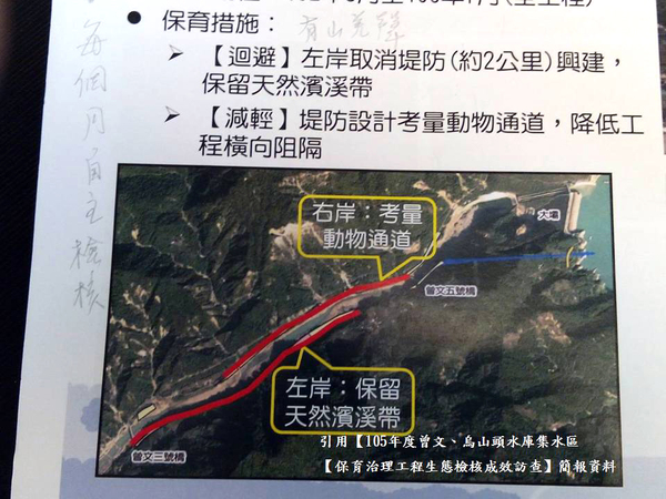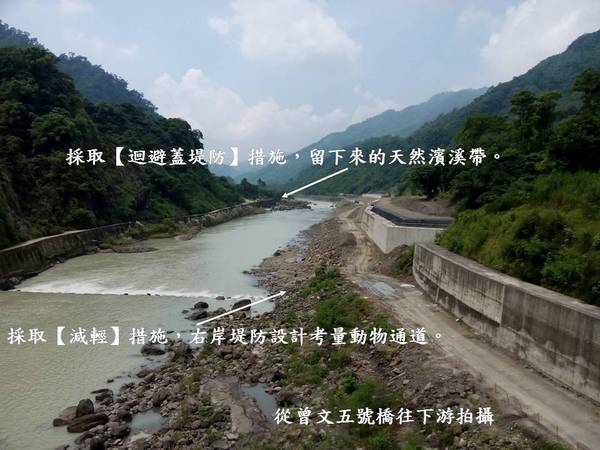當天所見幾個座落在曾文水庫湖域保護帶、烏山頭水庫蓄水範圍內的治理工程中,水利單位依據『生態檢核』的程序,分別採取了『減量』『迴避』『縮小』『補償』等保育措施。玆分別舉出兩個蓄水區域內的案例: