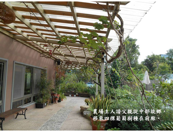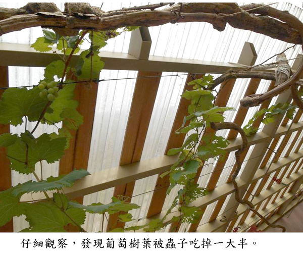 農場滿園綠意,花木扶疏,走到前廊的葡萄藤下,發現葡萄樹葉被蟲子吃掉了一大半。這是農場主人請父親從中部故鄉移植來的四棵綠葡萄,他們不噴農藥,讓蟲子隨意吃,服膺的正是長輩的教導。