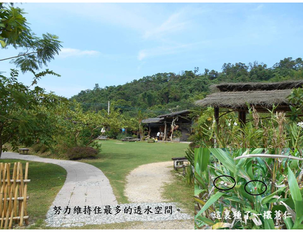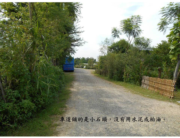 交通工具行走的車道,或是耕耘機具通行的道路,鋪的是小石頭,沒有用水泥或柏油,努力維持住最多的透水空間。