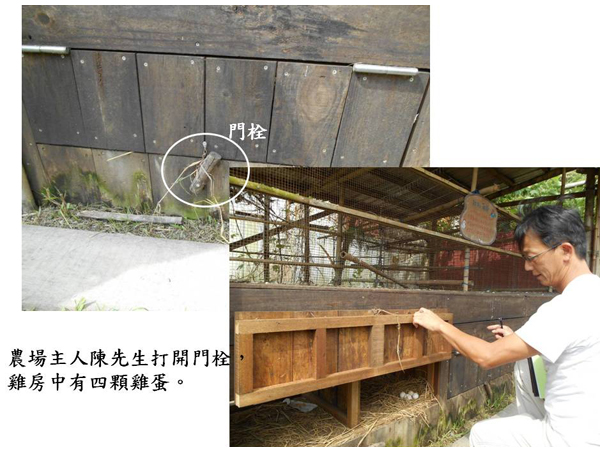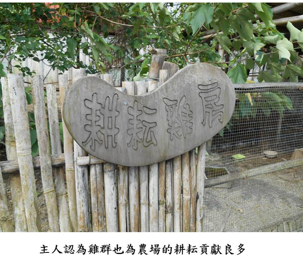 主人認為雞群也是農場的好幫手,所以他為雞群蓋了舒適的居住空間,白天時全部都跑到田裏吃蟲子,趕走吃穀子的鳥群,為農場貢獻良多;我們前往參觀的時候,主人陳先生打開門栓,雞房中有四顆雞蛋。在木瓜田那裏,看見幾隻雞在散步,好像也在找東西吃。