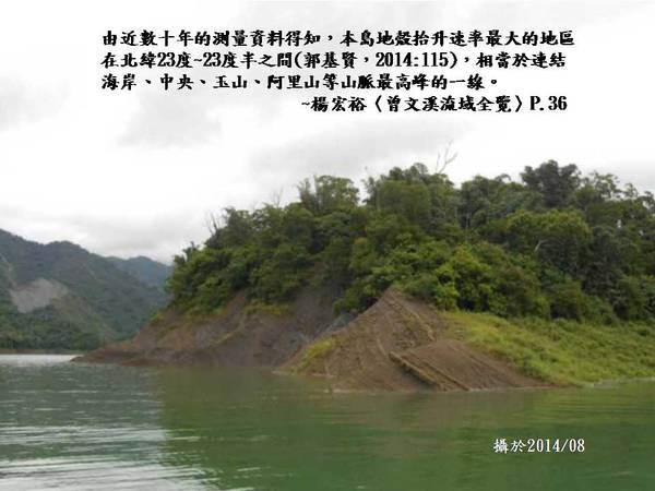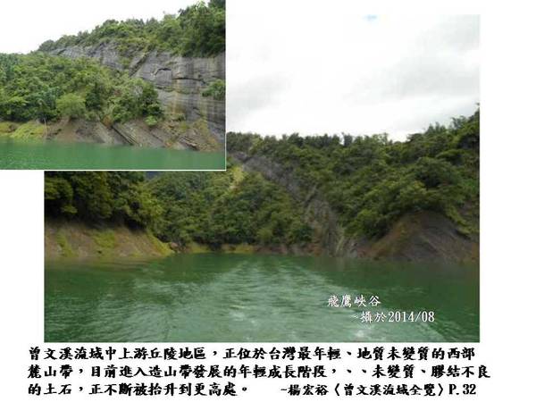 〈二〉曾文溪流域中上游丘陵地區,正位於台灣最年輕、地質未變質的西部麓山帶,目前進入造山帶發展的年輕成長階段,、、未變質、膠結不良的土石,正不斷被抬升到更高處。~楊宏裕《曾文溪流域綜論》〈曾文溪流域全覽〉P.32