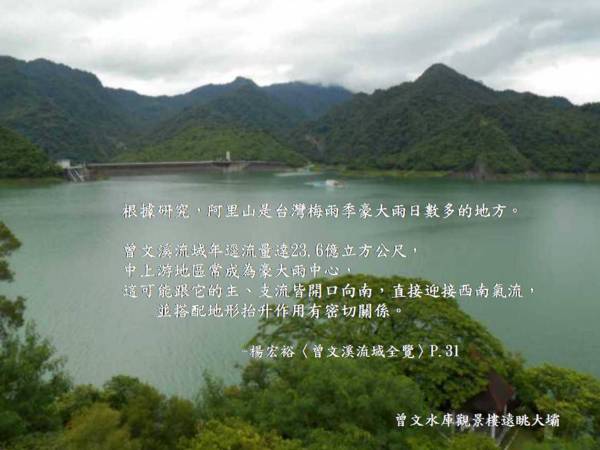 〈一〉根據研究,阿里山是台灣梅雨季豪大雨日數多的地方。曾文溪流域年逕流量達23.6億立方公尺,中上游地區常成為豪大雨中心,這可能跟它的主、支流皆開口向南,直接迎接西南氣流,並搭配地形抬升作用有密切關係。