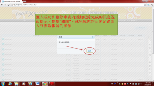 4.3.8) 匯入成功和刪除車錶內活動紀錄完成的訊息視窗提示,點擊"關閉"。就完成你的活動紀錄匯入到雲端帳號的操作。
