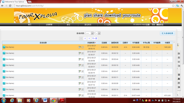 4.3.9) 然後就會接著前往你的個人活動紀錄的一覽表畫面,如下圖示,即完成將車錶內活動紀錄的匯入你的tour.xplova.com雲端帳號內。