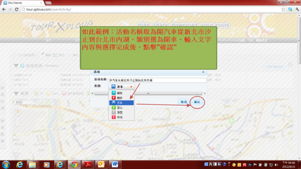 5) 如此範例︰活動名稱取為開汽車從新北市汐止到台北市內湖,類別選為開車。輸入文字內容與選擇完成後,點擊"確認"。