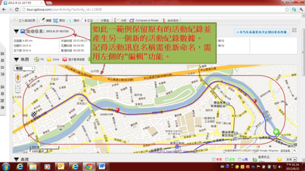 上傳到個人活動的資料內,可將活動紀錄軌跡另再做剪切或是剪切產生另一項紀錄,來將多餘的活動紀錄移除或是分享朋友不讓不想曝光的位置在地圖畫面上出現。