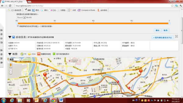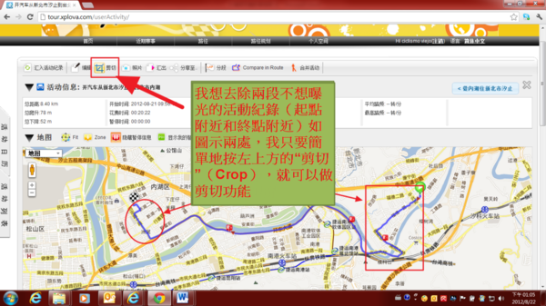 1) 如範例︰我想去除兩段不想曝光的活動紀錄(起點附近和終點附近)如圖示兩處,我只要簡單地按左上方的“剪切”(Crop),就可以做剪切功能。