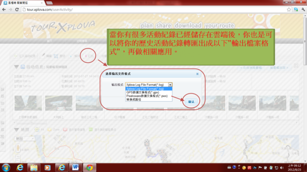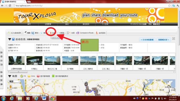 1)活動紀錄從tour.xplova.com雲端“匯出”功能,按下”匯出”
