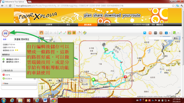 3.4.1) 將會出現以下畫面,自行編輯後儲存可以變成一條路徑。這新的路徑好處,可以做雲端競技用,或是分享給有導航導航功能的車錶使用。