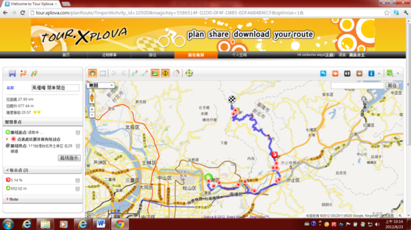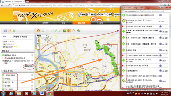 3.4.4) 若是有勾選第一項“路徑與路徑方向優化”,將會作雲端運算,使路徑生成後,給Xplova G3車錶,將有“方向提示(turn by turn)”功能產生。