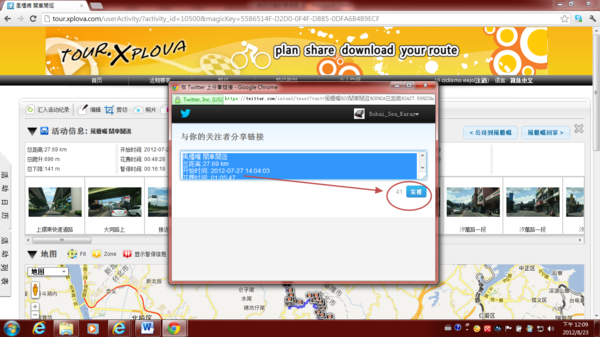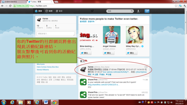 2) 你的Twitter的社群網頁將會出現此活動紀錄連結,朋友點擊後可看到你的活動紀錄與照片