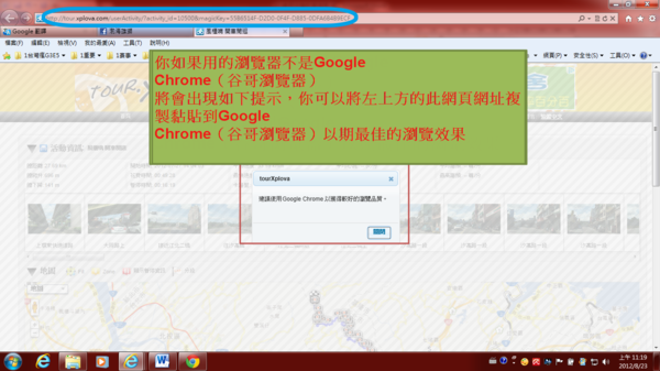3) 你如果用的瀏覽器不是Google Chrome(谷哥瀏覽器)將會出現如下提示,你可以將左上方的此網頁網址複製黏貼到Google Chrome(谷哥瀏覽器)以期最佳的瀏覽效果。
