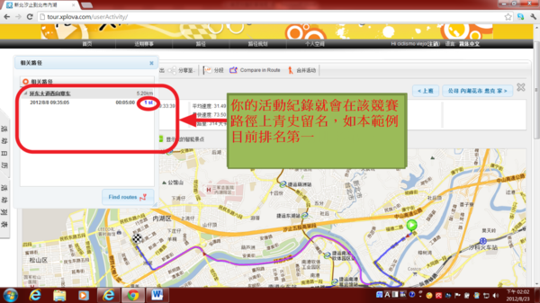 2.5.3) 你的活動紀錄就會在該競賽路徑上青史留名,如本範例目前排名第一