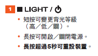 5)長按LIGHT/POWER 會執行POWER(開機或是關機)功能