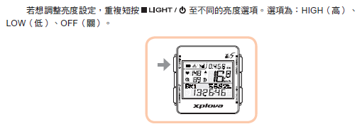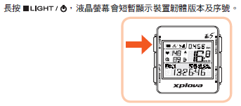 3)強迫關機按鈕 當遇到E5車錶當機(顯示畫面卡住不動)時,可以使用硬體強迫關機按鈕。長按此LIGHT/POWER按鈕五秒以上不放,就會強迫執行硬體關機指令。畫面就會完全消失,可是當機前的活動紀錄是會被儲存的。未來上傳活動紀錄到tour.xplova.com你的”個人活動”內,你先前當機前的資料多數是會存在的且可以上傳的。