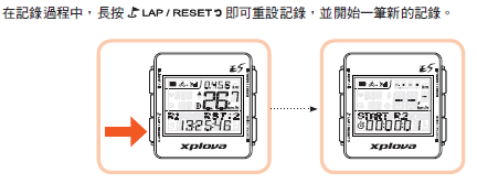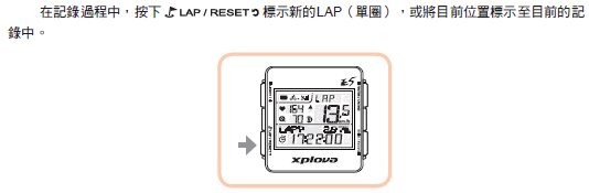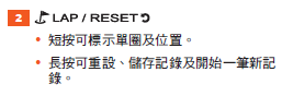 1)短按LAP/RESET 就會執行LAP(圈數、路線紀錄分割或位置標注)功能