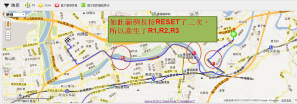 也就是未關機前,例如按了三次長按RESET,傳統的車錶會有四個獨立的紀錄活動軌跡,但是E5的操作模式僅有一條活動軌跡,只是會有三個明顯的路線中之額外起點(RESET)的圖案出現。