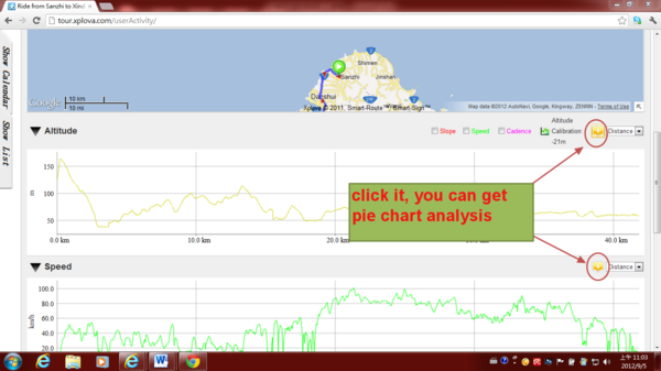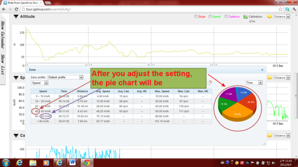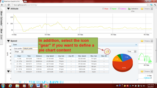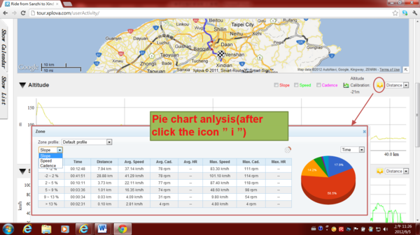 The activity contain main six data. But also can be shown by pie chart.Just go to select the orange "i" (Zone), contains the Altitude, Speed, Cadence, HRM, Power and temperature data, all can be presented in a pie chart analysis.