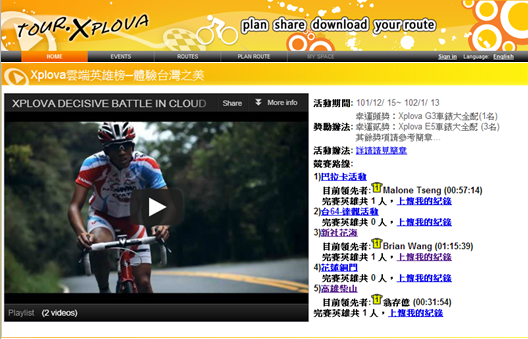 為鼓勵全民運動,在安全健康的前提下,運用自行車來鍛鍊身體,藉此在台灣各地同時引燃冬季的快樂騎乘。繼XPLOVA雲端大決戰—決勝風櫃嘴之巔完滿落幕後,再次舉辦下一場活動,此次活動名稱為XPLOVA雲端英雄榜—體驗台灣之美。將會在台灣五地同步啟動,讓各地熱愛騎乘單車的朋友,在休閒之餘,穿著舒適的車衣,與好友們快樂地體驗享受台灣之美,並結合科技的雲端平台,引領參與者在跨越時空的平台上,不論你是用GPS車錶或是利用有GPS的智慧手機以APP運動軟體來記錄,並上傳您的軌跡紀錄,鼓勵大家一起走出戶外運動擁抱大自然。