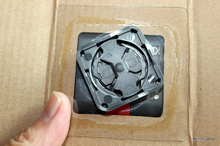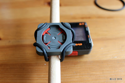四個圈圈是橡皮圈,用來固定上方的卡座,看要固定的手把粗細選擇大圈或小圈各兩個。卡座有兩層,橘色軟橡膠疊在灰黑色卡座機構下面,可以根據要安裝的位置橫擺或直擺。
