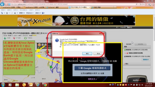 I.E.瀏覽器搭配tour.Xplova雲端軟體常常不穩定,有的使用者會出現如此畫面,明明裝好Google Earth還不能用,所以建議用Google Chrome瀏覽器來操作tour.Xplova雲端軟體會呈現最佳的效果。