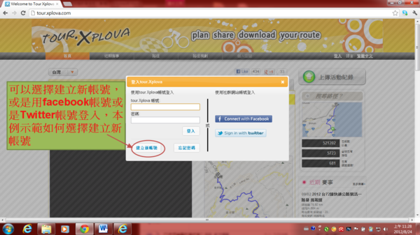 4.1)可以選擇建立新帳號,或是用facebook帳號或是Twitter帳號登入,本例示範如何選擇建立新帳號