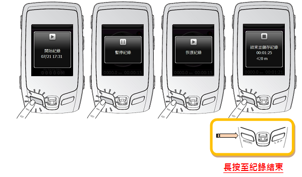 可按壓(短按) “RECORD (記錄/結束鍵)”開始記錄、暫停記錄、或繼續記錄。長按”RECORD”時,Xplova G3 車錶會倒數三秒後結束及儲存記錄。