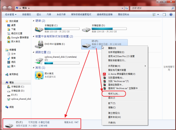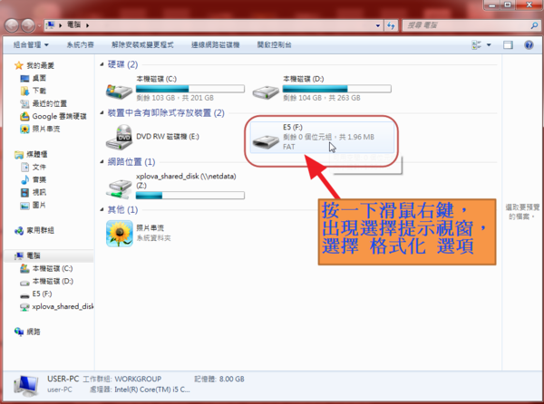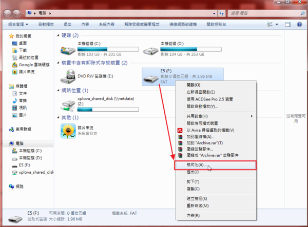 2.4)按一下滑鼠右鍵,出現選擇提示視窗,選擇 格式化 選項。