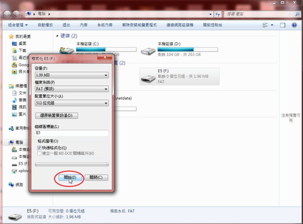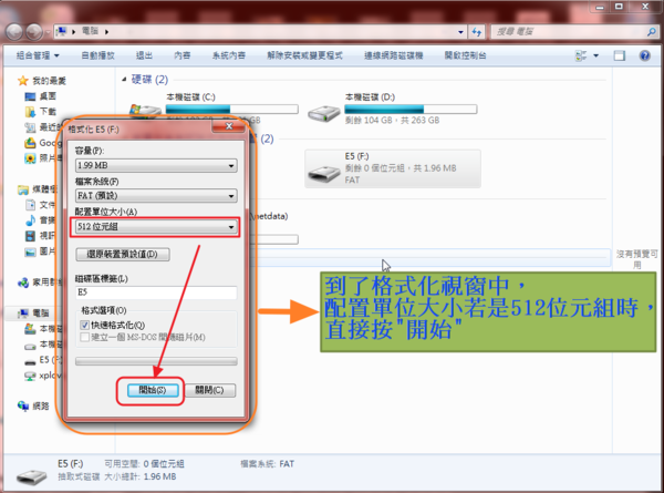 2.5)到了格式化視窗中,配置單位大小若是512位元組時,直接按"開始"