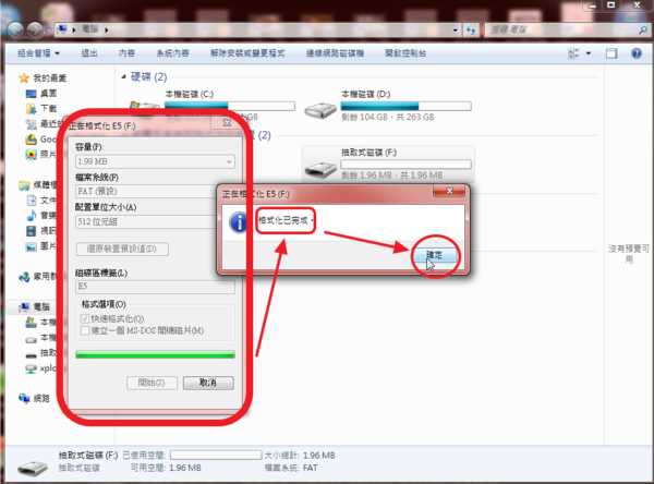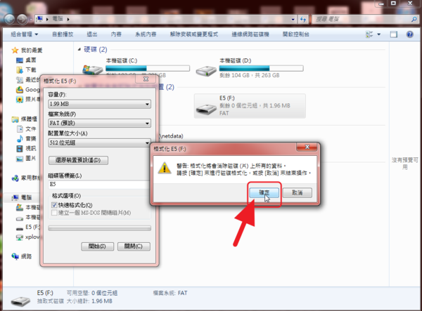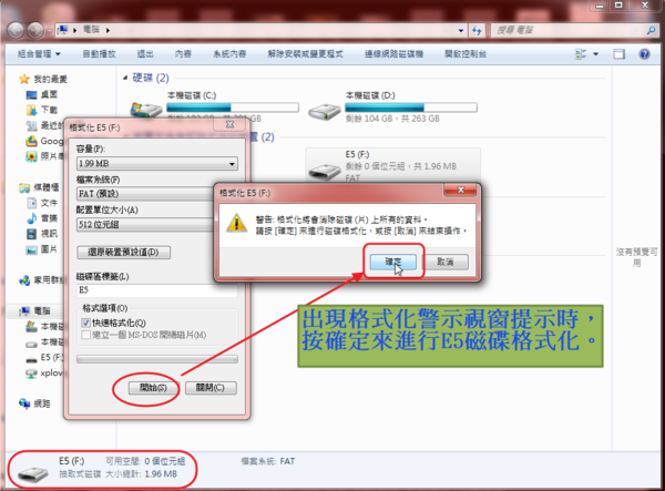 2.6)出現格式化警示視窗提示時,按確定來進行E5磁碟格式化。