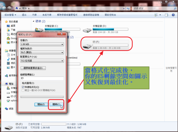 2.7)當格式化完成後,"關閉"格式化視窗,你的E5剩餘空間如圖示,將回復到記錄儲存空間最佳化。