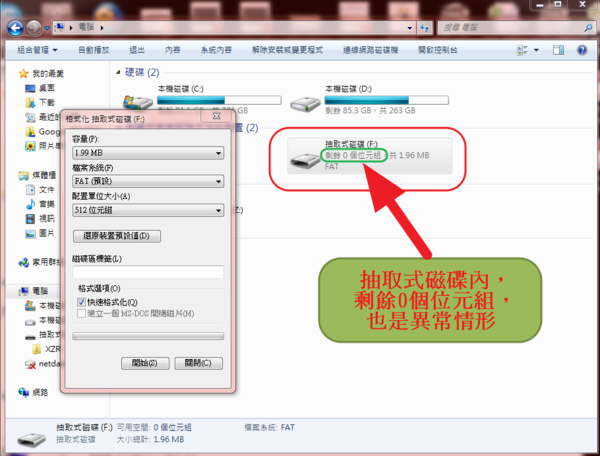 1.2.2)抽取式磁碟內,剩餘0個位元組,也是異常情形。如圖示