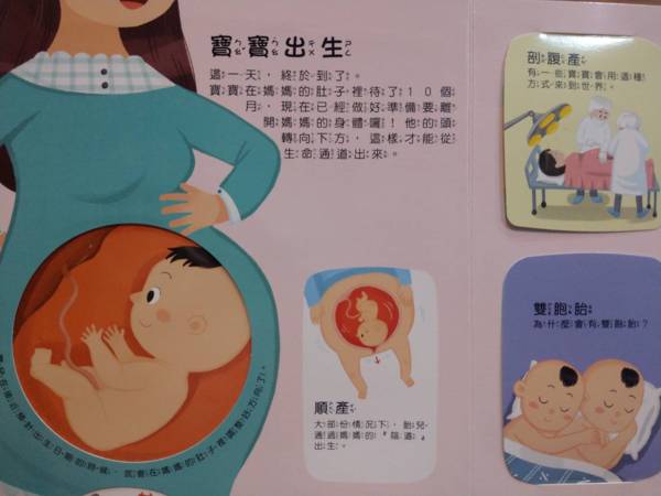 這本書其實很淺顯易懂,先從生命的開始講起,從精子卵子和受精卵,到媽媽身體子宮,再到胎兒變化跟出生,連寶寶在肚子裡聽得到看得到還會打嗝都畫出來了,然後才是出生的方式。