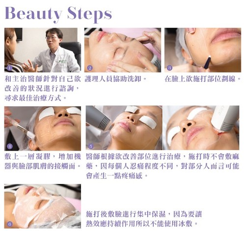 改善症狀:眼部細紋、眉毛下垂、蘋果肌消失、臉頰凹陷、斑點、嘴邊肉鬆弛下垂、唇周細紋明顯、鬆弛下顎線條、頸部皺紋。