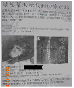 後記:97年7月1日我跟同事一起討論要網購蛋糕,當同事拿著宣傳單過來給我參考時我看到背面的宣傳單,於是我便問了這個故事出來,有點感動同事真的很有愛心,小倆口收養這隻狗已經剛好一年了,我便說我幫他把這宣傳照放在我部落格上說不定它主人剛好是我的讀者,同事又說它主人或許已經不要它了,因為它的後腿已經不良於行,連跑步都有問題,聽完這個故事我覺得這隻狗真的很幸福,有兩個主人都很疼愛它,就算它今天找不到回家的路,它依舊有著全新的家,我想給它祝福,當然或許有人感嘆人不如狗,流浪狗有人疼有人愛,而流浪漢卻沒有人願意無私的收容,連回家的路都遙遙無期,或許這是個很好的省思故事,每個人都有個家,所以當你可以有回家的路時請記得要常常回家,家才是個給人溫暖的好地方,而家人是該給彼此力量的最大核心。