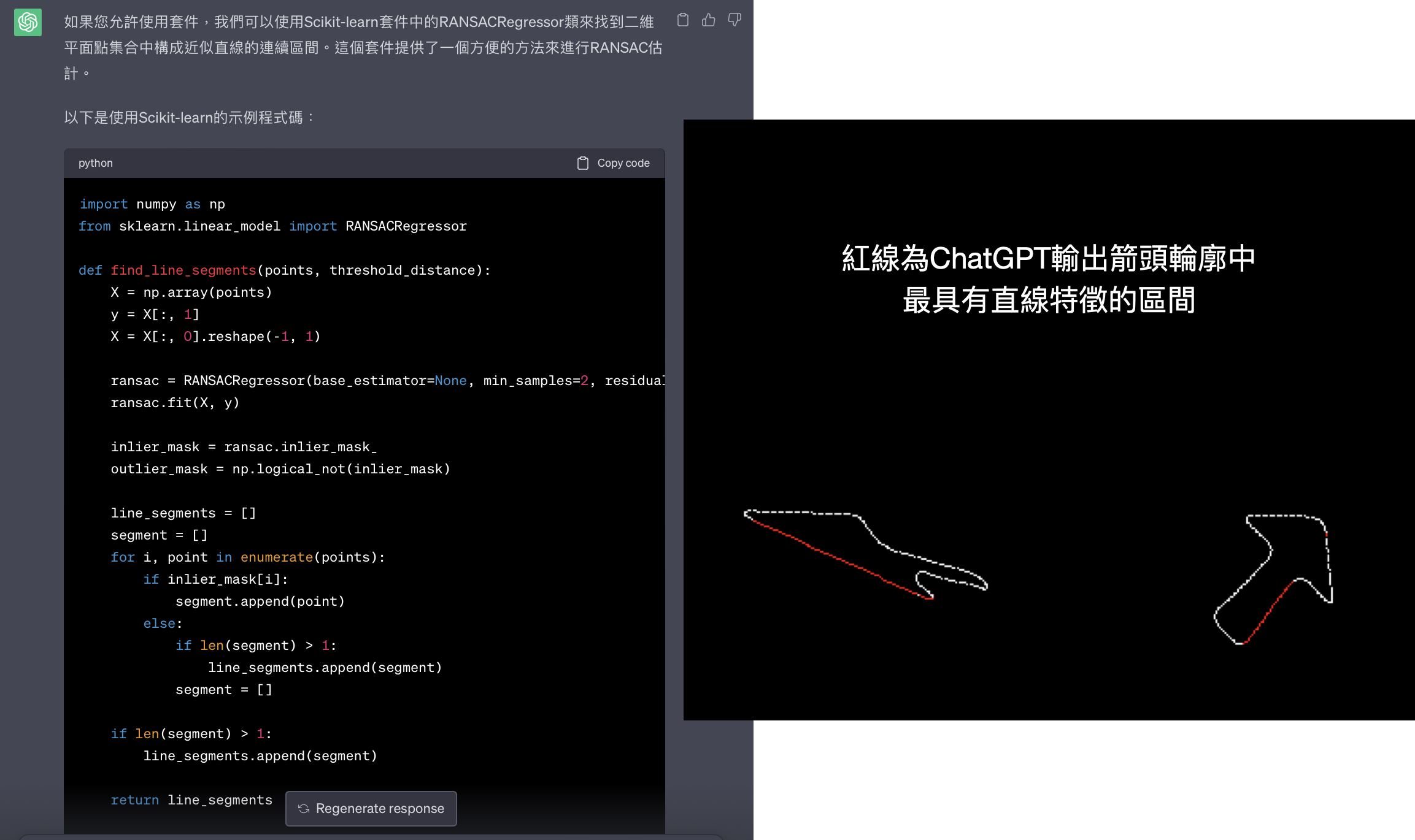 接下來,我想請他做比較困難的題目。找出輪廓的點集合中,具有「直線」特徵的區間。於是我這麼問ChatGPT: