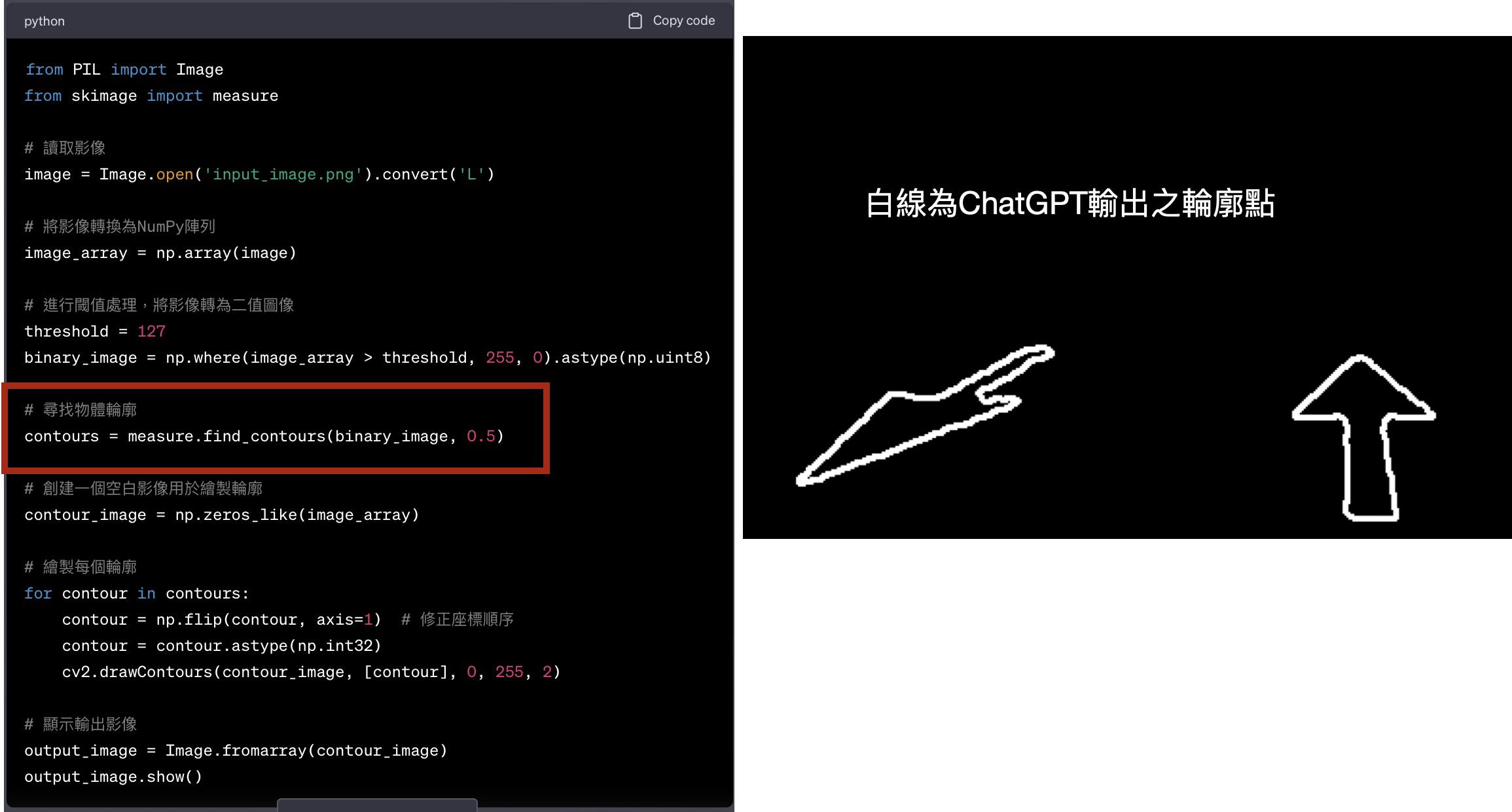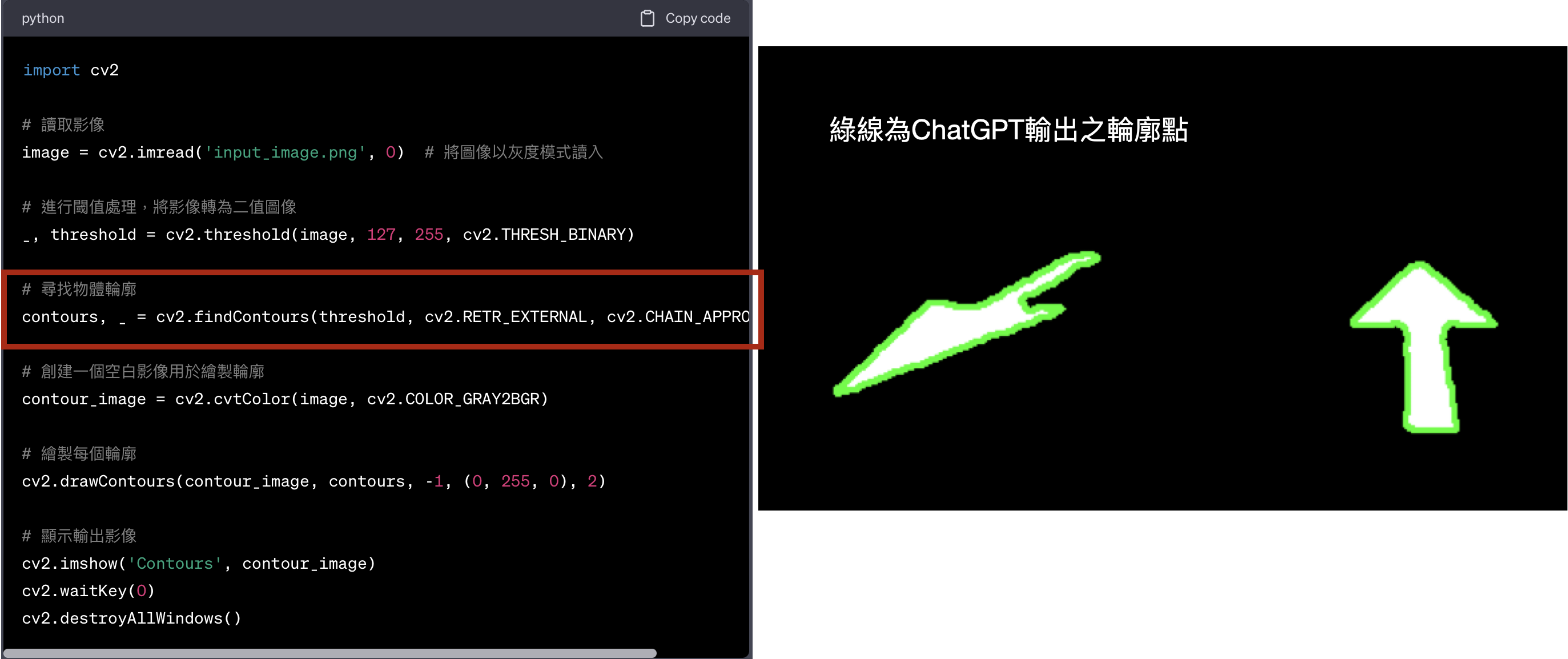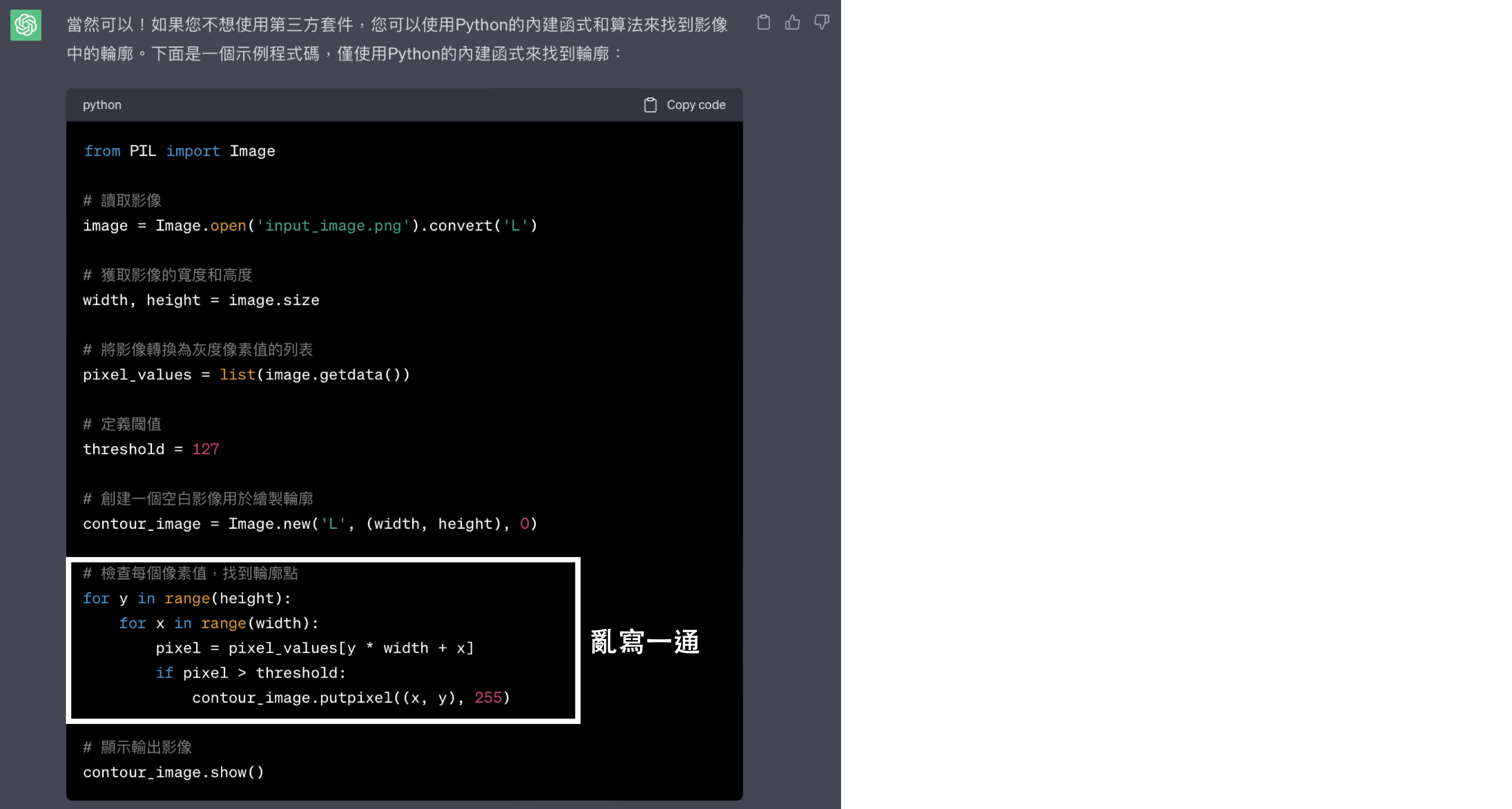 ChatGPT的做法是使用OpenCV庫的findContours函數(上圖紅匡處)來得到我要的結果。但這樣嚴格說起來就不是ChatGPT自己寫「找輪廓」這個程式了,他是「使用」別人寫好的程式來達到這個功能。然而我就是想讓ChatGPT自己寫看看,所以給了另一個要求: