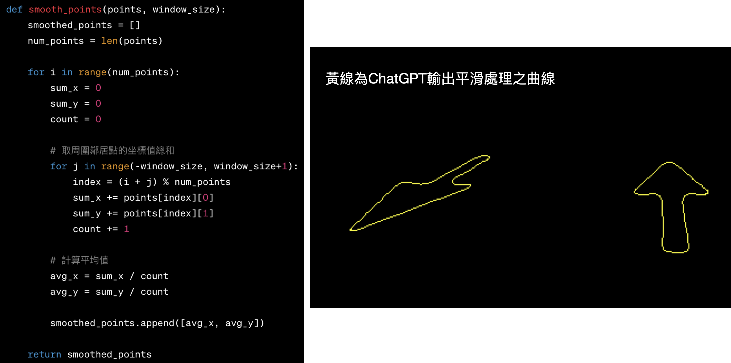 我們就前面輸出的輪廓(點集合)來用吧。不過真實世界的訊號常常具有一些雜訊,因此常常會讓訊號經過平滑處理,於是我想看ChatGPT怎麼對封閉曲線做平滑處理。