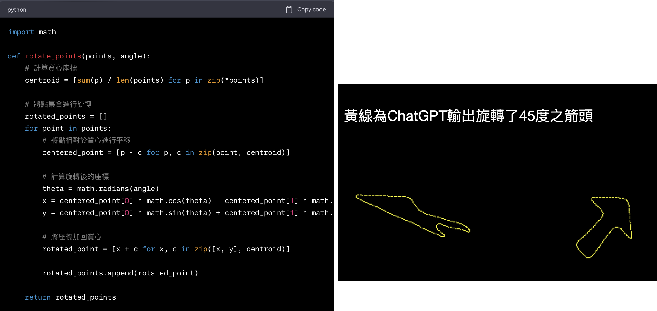 正確地給了我要的功能!兩個箭頭都順時針旋轉了45度。ChatGPT對於矩陣運算或座標轉換挺在行的!