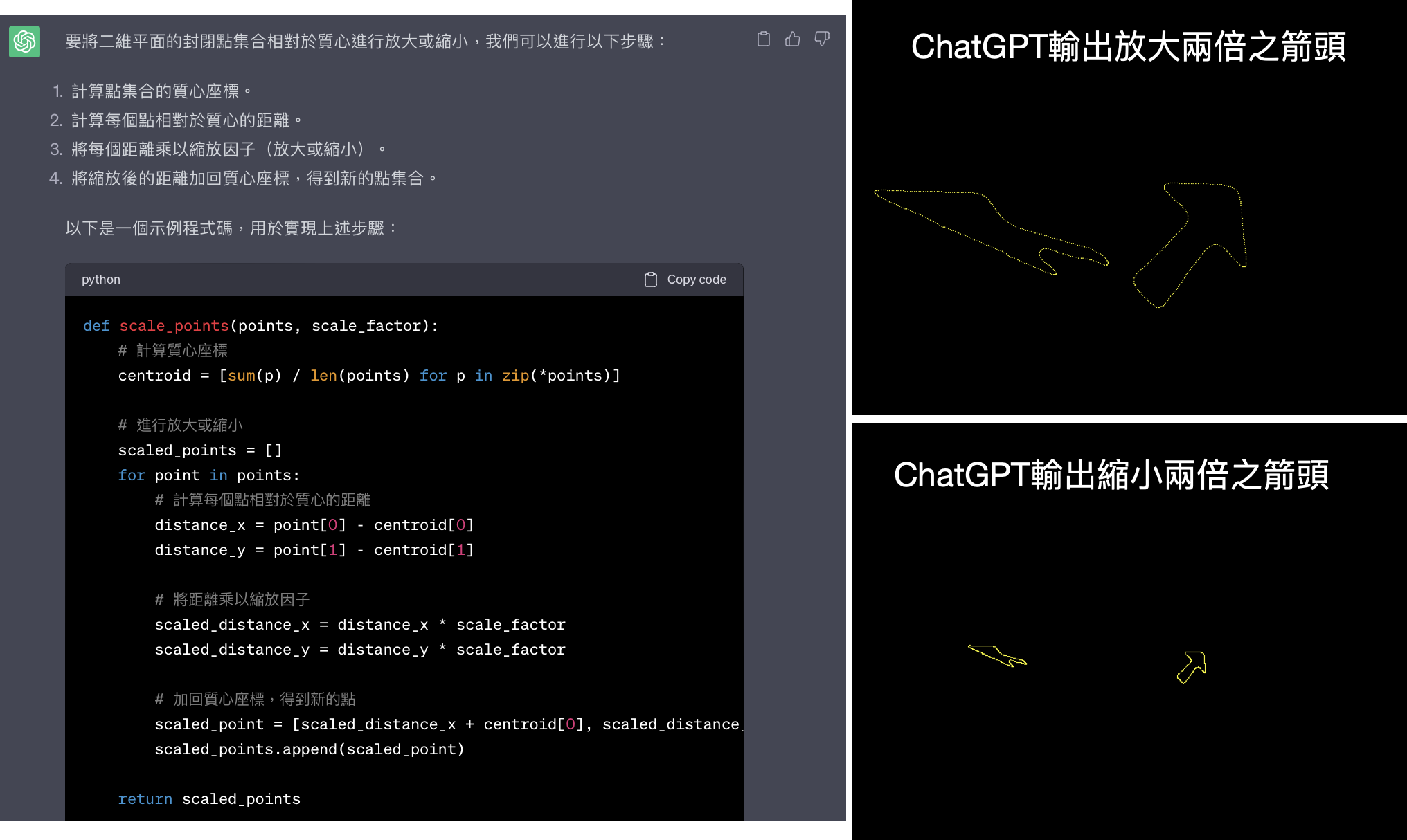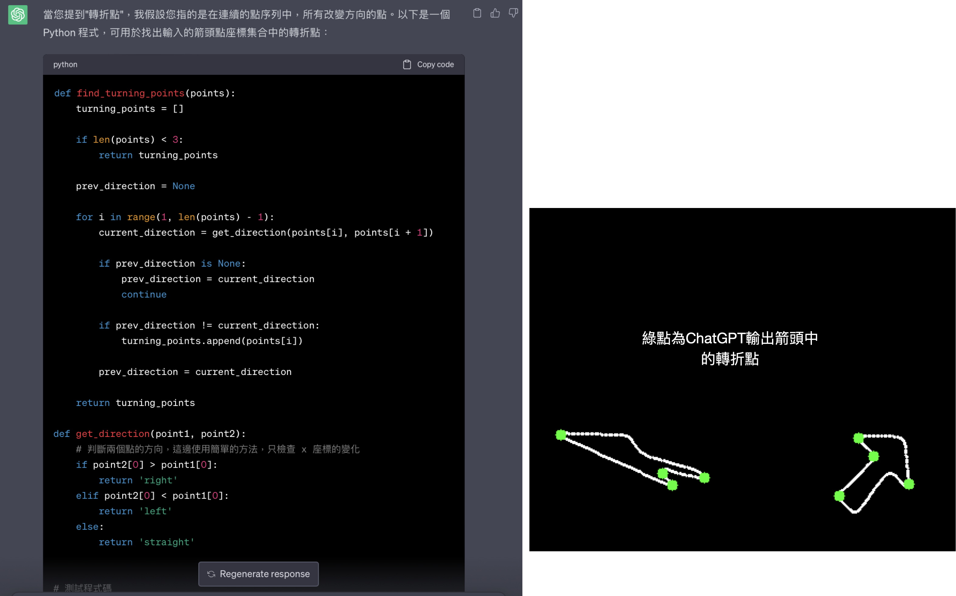 ChatGPT第一次給我的程式碼看起來合邏輯,但實際上不能用,因為ChatGPT設定只要不是完美地在前兩個點構成的直線上,就歸為「轉折點」,這樣我的箭頭幾乎快要每個點都成為轉折點了!我不死心,再次要求他寫一個可以用的程式給我,他給了我另一段程式碼