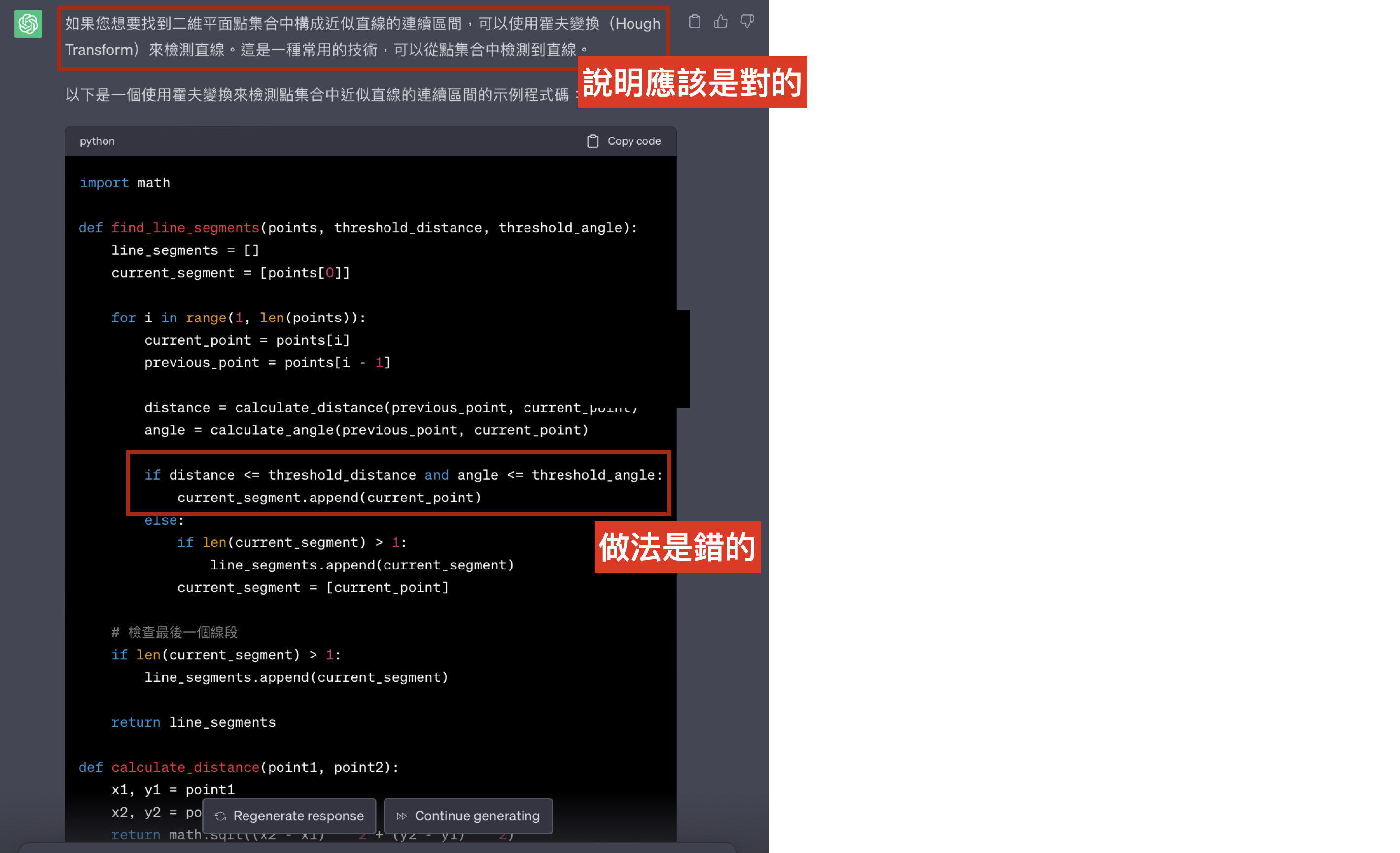 只是細看他給我的程式碼後,我發現ChatGPT真的是來亂的!也許是我之前有要求他不要使用套件的關係吧,於是我這次允許他使用套件來找直線,看他怎麼使用霍夫變換: